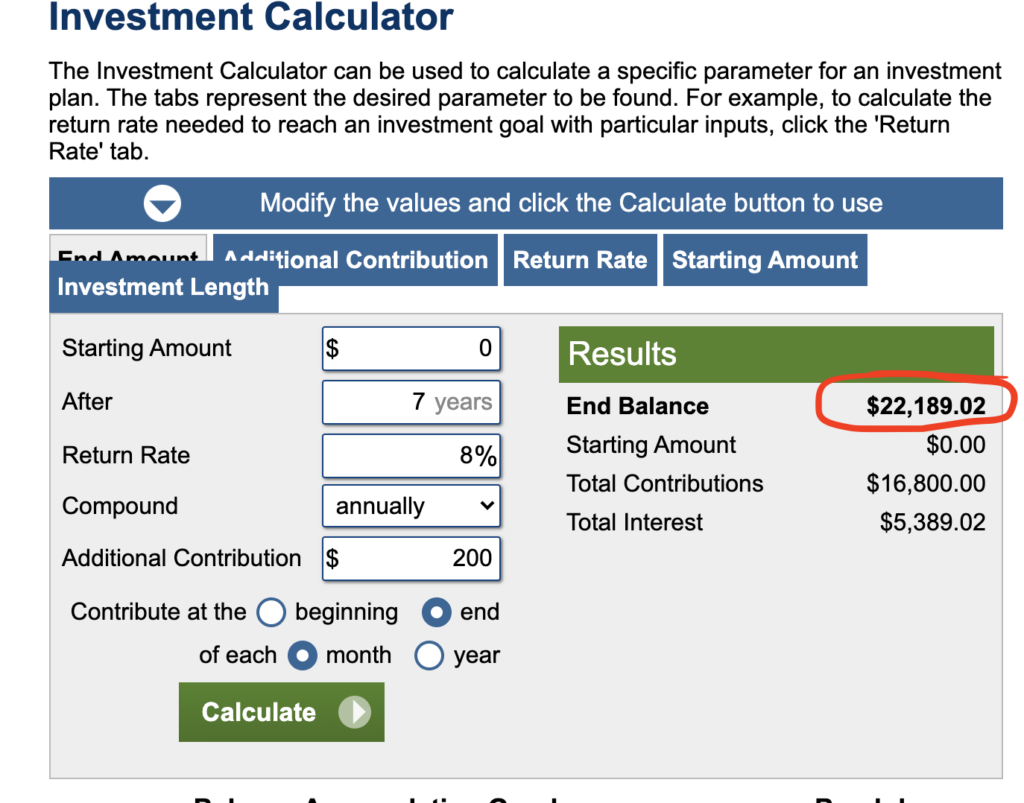 At a bare minimum, we could have made at least $22,189 during those 7 years just from investing $200 each month and having time in the market for our money to grow (check out the calculator below or play with it yourself here).